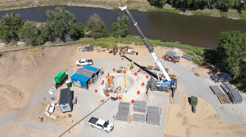 Carollo, in collaboration with nine subconsultants, developed a horizontal well solution to maximize well yield and water quality. The design features 20-foot diameter concrete caissons that extend to bedrock, with 10 horizontal screened laterals extending up to 100 feet into the alluvial zone. These horizontal wells yield approximately 10 times more water than traditional vertical wells, significantly improving the efficiency of the water supply system. This design is only the second of its kind in Colorado, showcasing Carollo’s ability to bring novel solutions to the region. The horizontal well system reduces the need for frequent maintenance and rehabilitation, cutting down on long-term costs while also increasing system reliability.