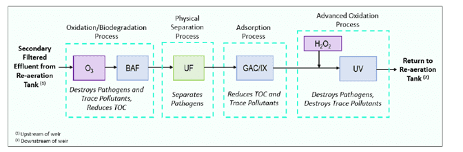 As its population grows, Florida’s existing groundwater supplies are not projected to meet future demand, driving state leaders to look for alternative water supplies. Potable reuse is one possible option. Traditional treatment trains consisting of membrane filtration followed ultraviolet (UV) light disinfection, or a combination of UV and advanced oxidation (AOP) can include high construction costs, high operating costs, and the generation of a waste brine stream that must be disposed of. While coastal communities can discharge this brine to the ocean, inland communities like the City of Altamonte Springs, Florida cannot, making certain advanced treatment methods impractical.