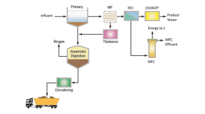 Replacing the high-rate, up-flow anaerobic sludge bed process with a microbial fuel cell provides a direct power source derived from the diverted wastewater organics.